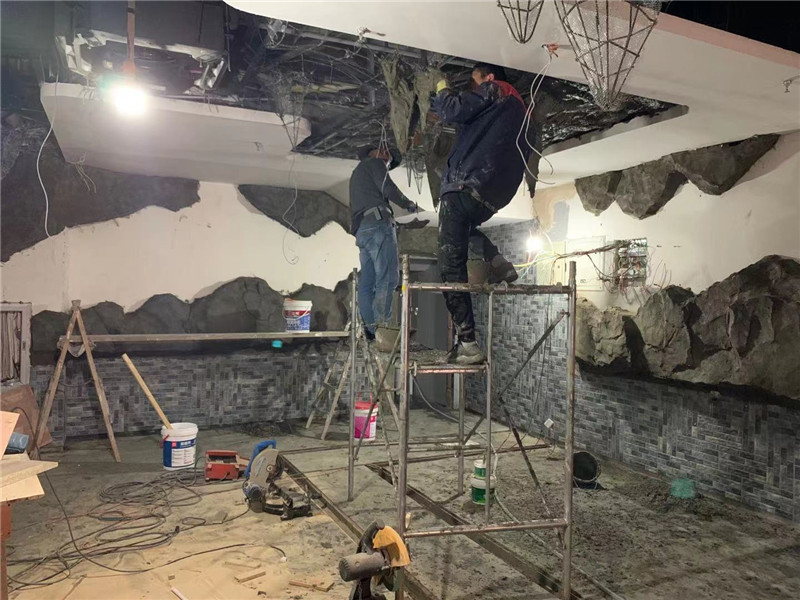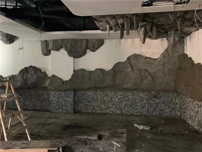 本單位承接上海滴水湖馨苑室內(nèi)水泥直塑,場所是一家燒烤酒吧,設(shè)計師的設(shè)計靈感來自于山海經(jīng)內(nèi)部場景,山海經(jīng)內(nèi)部大量運用了山水,餐廳整個墻壁及頂部都運用了山體造型包裹,把水泥直塑運用在整個裝修,體現(xiàn)出人在山洞中體現(xiàn)古代人文生活,在這種環(huán)境喝著酒唱著歌一天的心情放松很多。水泥直塑采用了水泥直塑內(nèi)部鋼骨架結(jié)構(gòu),經(jīng)過專業(yè)的師傅雕刻最終呈現(xiàn)出山體感覺。總體工程量在300平方米左右運用工期20天。水泥直塑假山在現(xiàn)代裝修中大量被設(shè)計師運用。將成為一個時代的主流。期待后期的效果